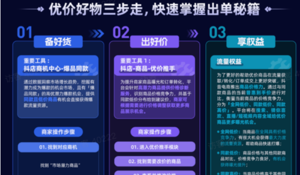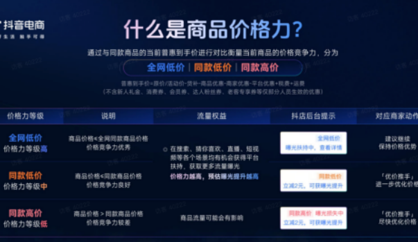 今年年初,抖音官方针对价格也发布了专属的方法论,对商品的价格力进行了定位。商品价格力指的是,通过同款商品当前普惠到手价进行对比,衡量当前商品的价格竞争力,分为:全网低价、同款低价、同款低价。