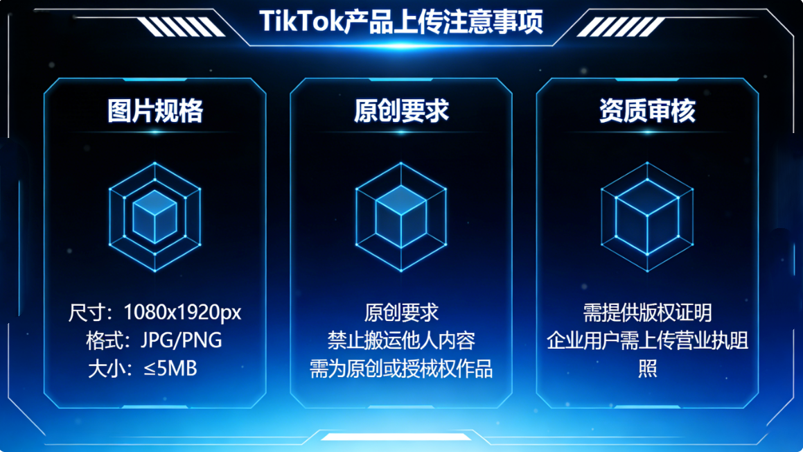 第三步,设置产品详情页。和其他跨境平台一样,TikTok也要求上传产品详情,可添加产品描述、文案、图片和视频,全方位介绍产品优势。这里有一个核心禁忌:严禁搬运文案和图片,系统会自动检测,一旦发现搬运,会直接导致产品上传失败。建议大家原创文案,图片优先使用自主实拍图,既避免侵权,也能提升产品信任度。