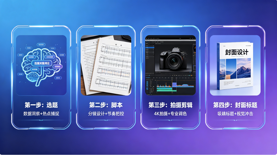 爆款内容的创作,主要分为“内容选题、脚本设计、拍摄剪辑、封面标题”四个核心环节,每一个环节都有对应的技巧,新手可以逐一突破。